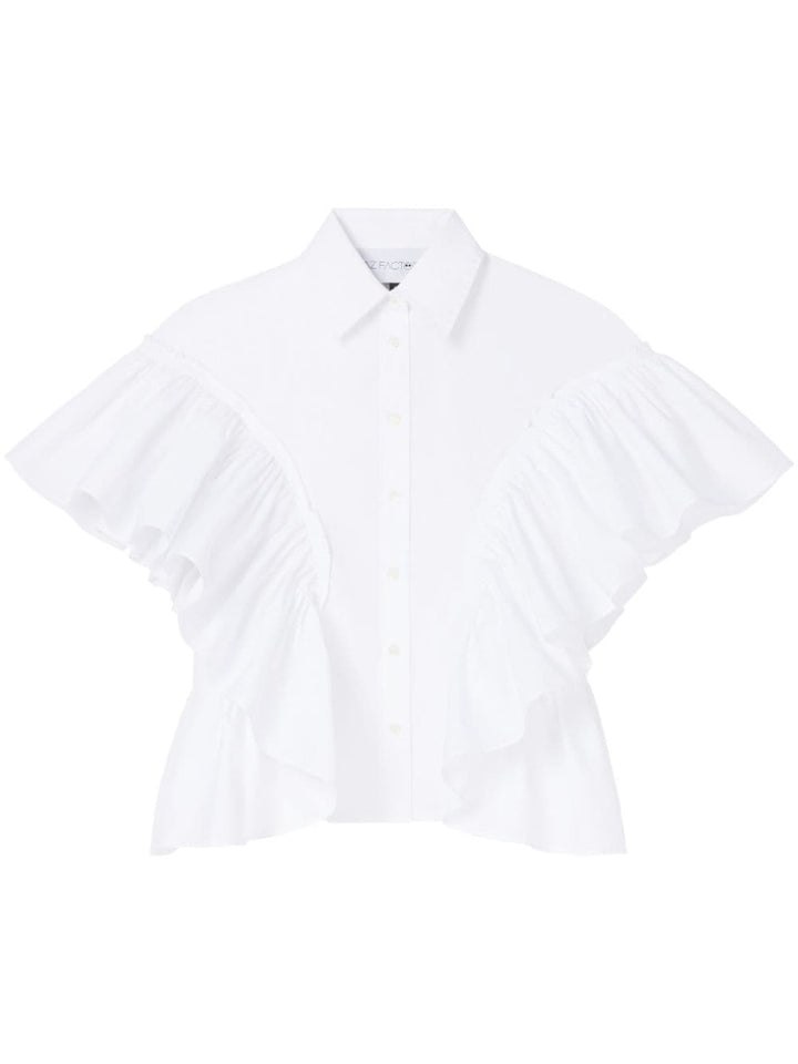 Waterfall ruffle-sleeve cotton shirt from AZ FACTORY featuring white, cotton, poplin texture, classic collar, short sleeves, front button fastening, ruffle cuffs and curved hem. m/l Ruffled sleeves cotton shirt Size and Fit - This piece fits true to size. We recommend you get your regular size. Model is 1,75m / 5ft 8in wearing size 36 (FR)