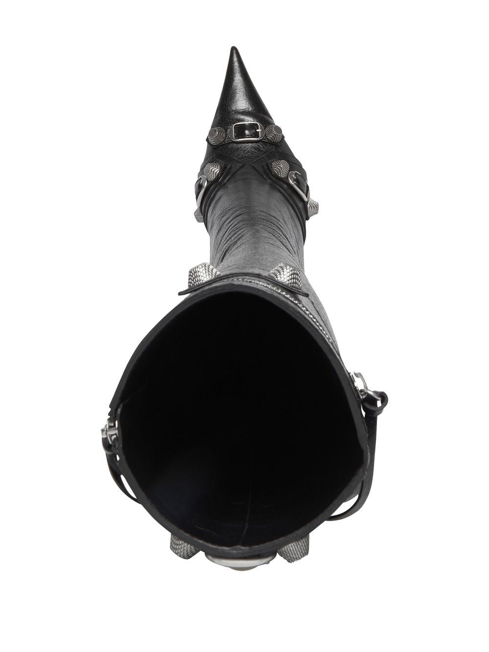 Cagole 90mm boots from BALENCIAGA featuring black, lambskin, pointed toe, high stiletto heel, palladium-tone hardware, stud embellishment, fringe detailing and side zip fastening. POSITIVELY CONSCIOUS: We've partnered with Good On You — an ethical agency that rates how sustainably brands perform across various people, planet and animal welfare criteria. This product comes from a Conscious brand that performs well in relation to their impact on the planet, for example ensures the use of materials that limit the amount of chemicals, water and wastewater involved in production processes.. Le Cagole leather boots Size and Fit - Heel 3,5 in / 9 cm