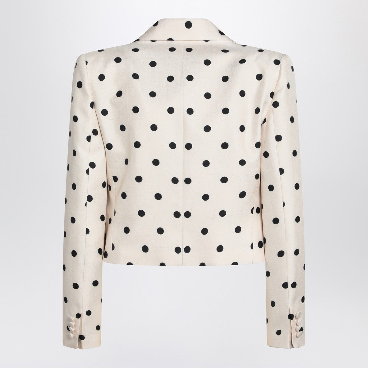 Single-breasted cropped jacket by Valentino in ivory silk shantung with all-over Pludepois print, characterized by pointed lapels, button closure, and bow detail on the front, and long sleeves with buttoned cuffs. Size and Fit - Model wears size 40 IT Model measurements: Height: 177 cm Chest: 83 cm Waist: 62 cm Hips: 90 cm