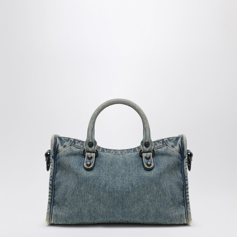 Small blue denim tote bag by Balenciaga with a faded effect, featuring two handles, an adjustable and removable shoulder strap, zip closure, leather zipper pull, front zip pocket, and internal zip pocket. Size and Fit - Width 30 cm x Height 19 cm x Depth 10 cm Adjustable shoulder strap length min 95 cm - max 110 cm Handle drop: 13 cm