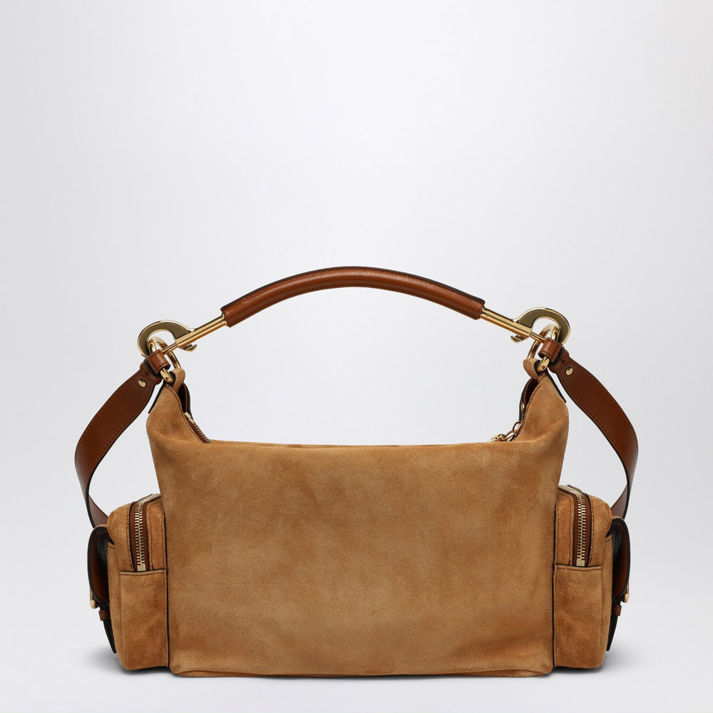 Chloé handbag in tan coloured suede leather, featuring a removable leather handle with carabiners, adjustable and removable shoulder strap, multi-pocket design, top zip closure, and an internal pouch pocket. Size and Fit - Width 34 cm x Height 16,5 cm x Depth 15 cm Adjustable shoulder strap length min 100 cm - max 120 cm Handle drop: 24 cm