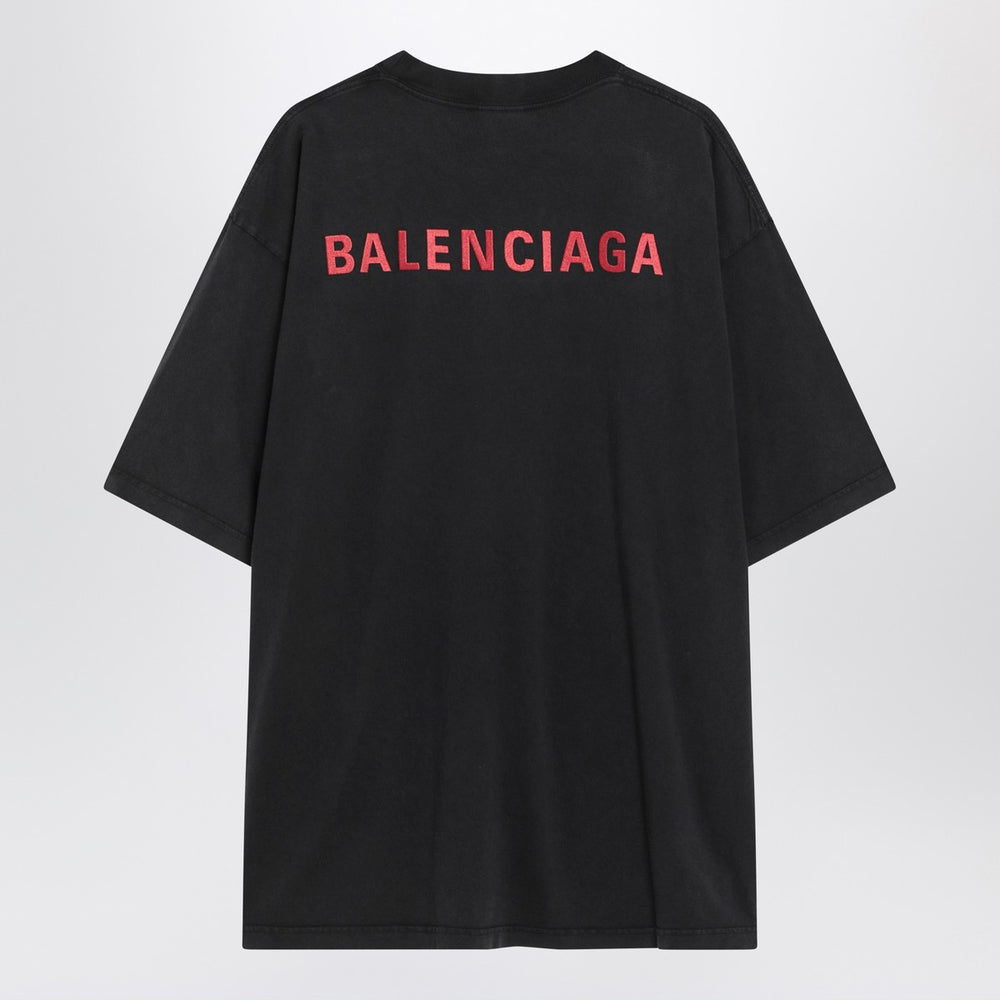 Balenciaga T-shirt in faded black cotton jersey, featuring a ribbed crew neck, short sleeves, and a contrasting red embroidered Balenciaga logo on the front and back. Size and Fit - Model wears size L Model measurements: Height: 187 cm Chest: 102 cm Waist: 76 cm Hips: 92 cm