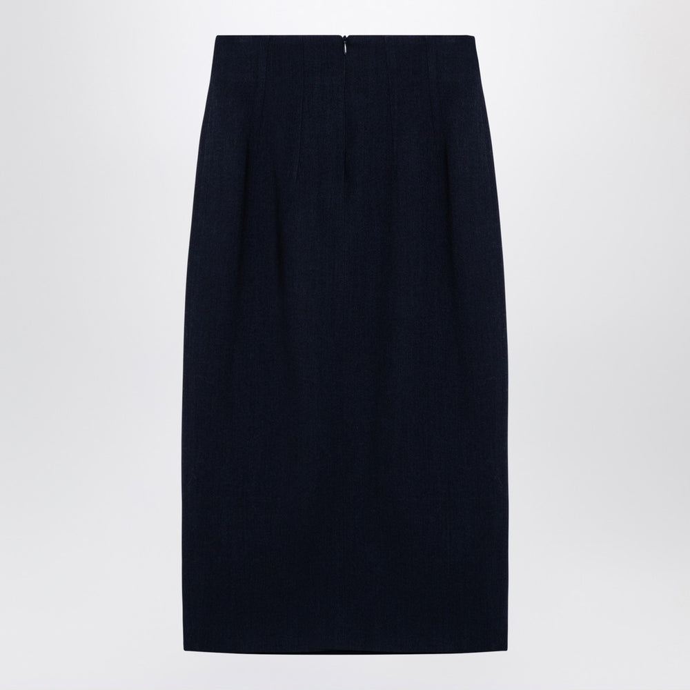 Navy blue virgin wool blend midi skirt from Margaux Lonnberg featuring a high waist, side slit and back zip fastening. Size and Fit - Model wears size 36 FR Model measurements: Height: 178 cm Chest: 77 cm Waist: 60 cm Hips: 87 cm