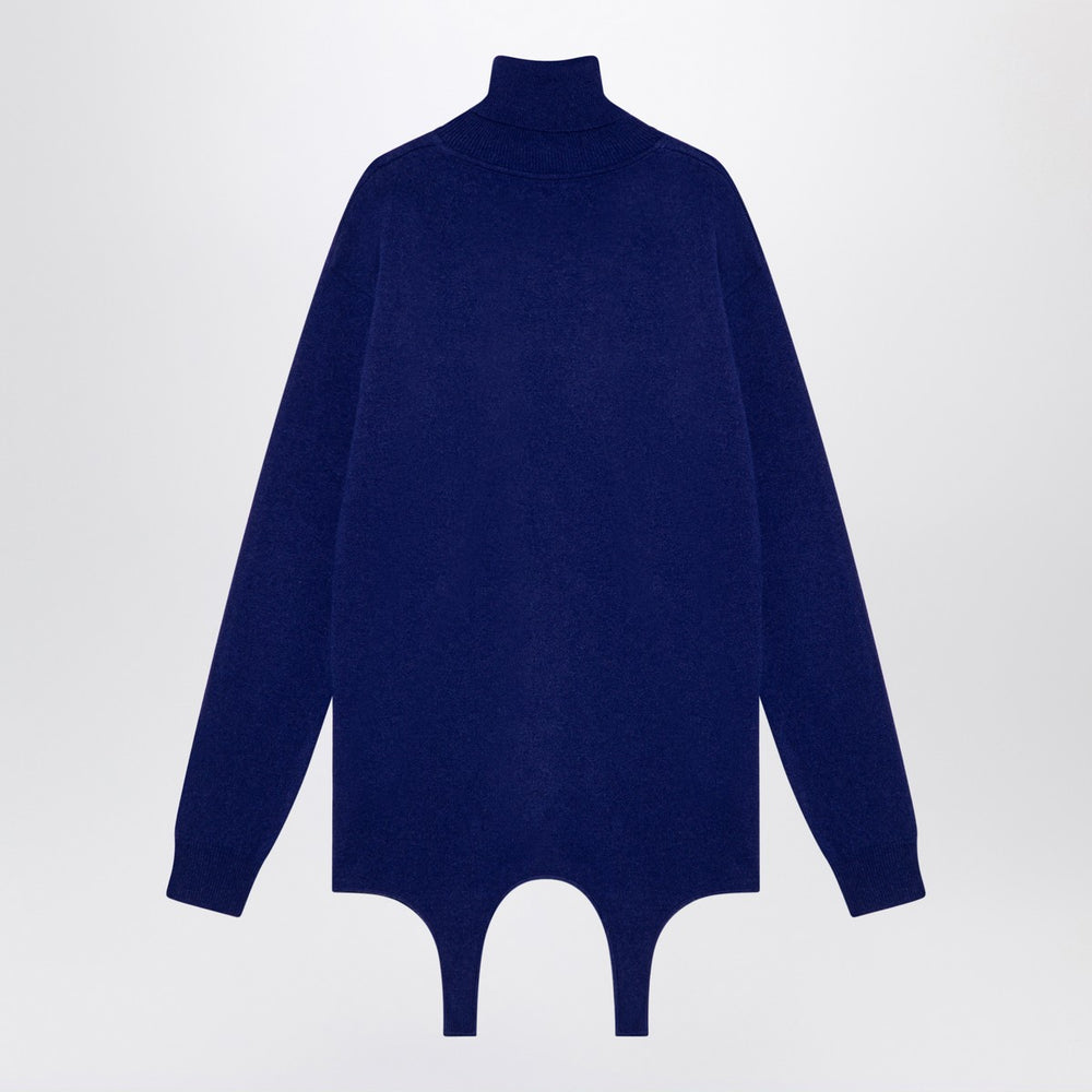 Electric blue cashmere pullover by Saint Laurent, features a high collar, long sleeves, a garter belt at the hem and ribbed hems. Size and Fit - Model wears size S Model measurements: Height: 179 cm Chest: 82 cm Waist: 65 cm Hips: 90 cm